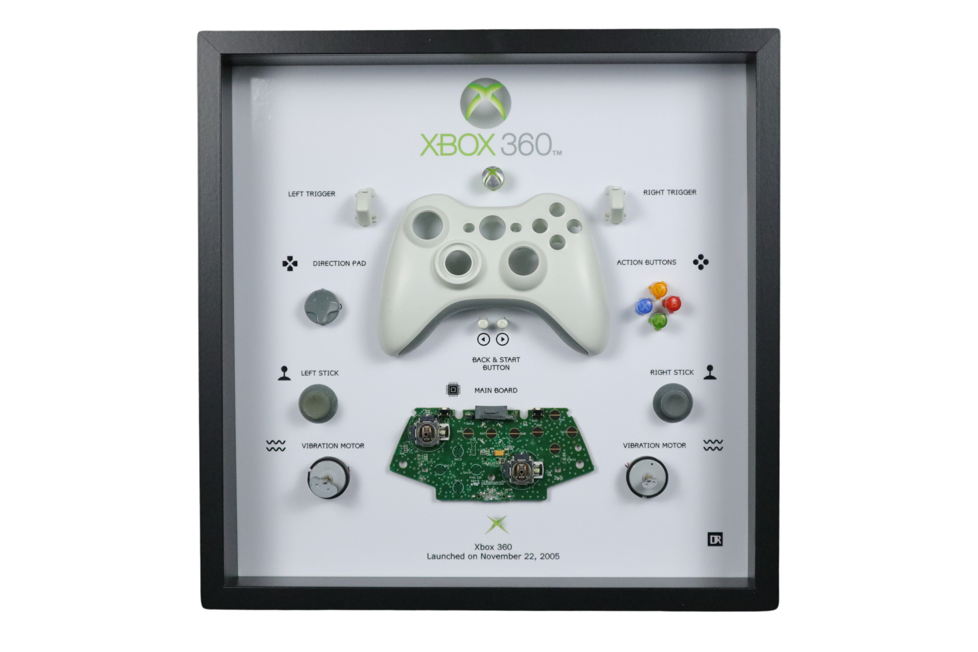Are you a true Xbox 360 fan? This one-of-a-kind frame art is a must-have for your collection! Crafted from an original Xbox 360 controller, this stunning piece showcases a detailed depiction of what is inside of a classic gaming controller!