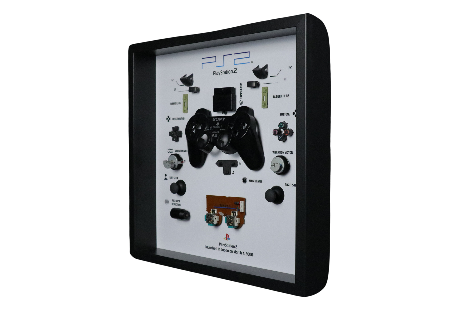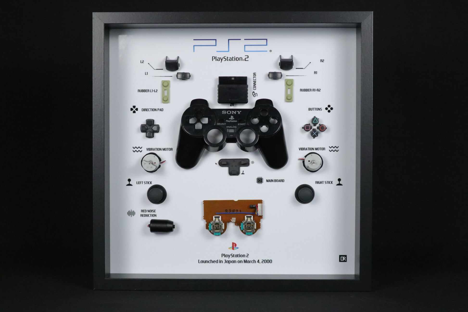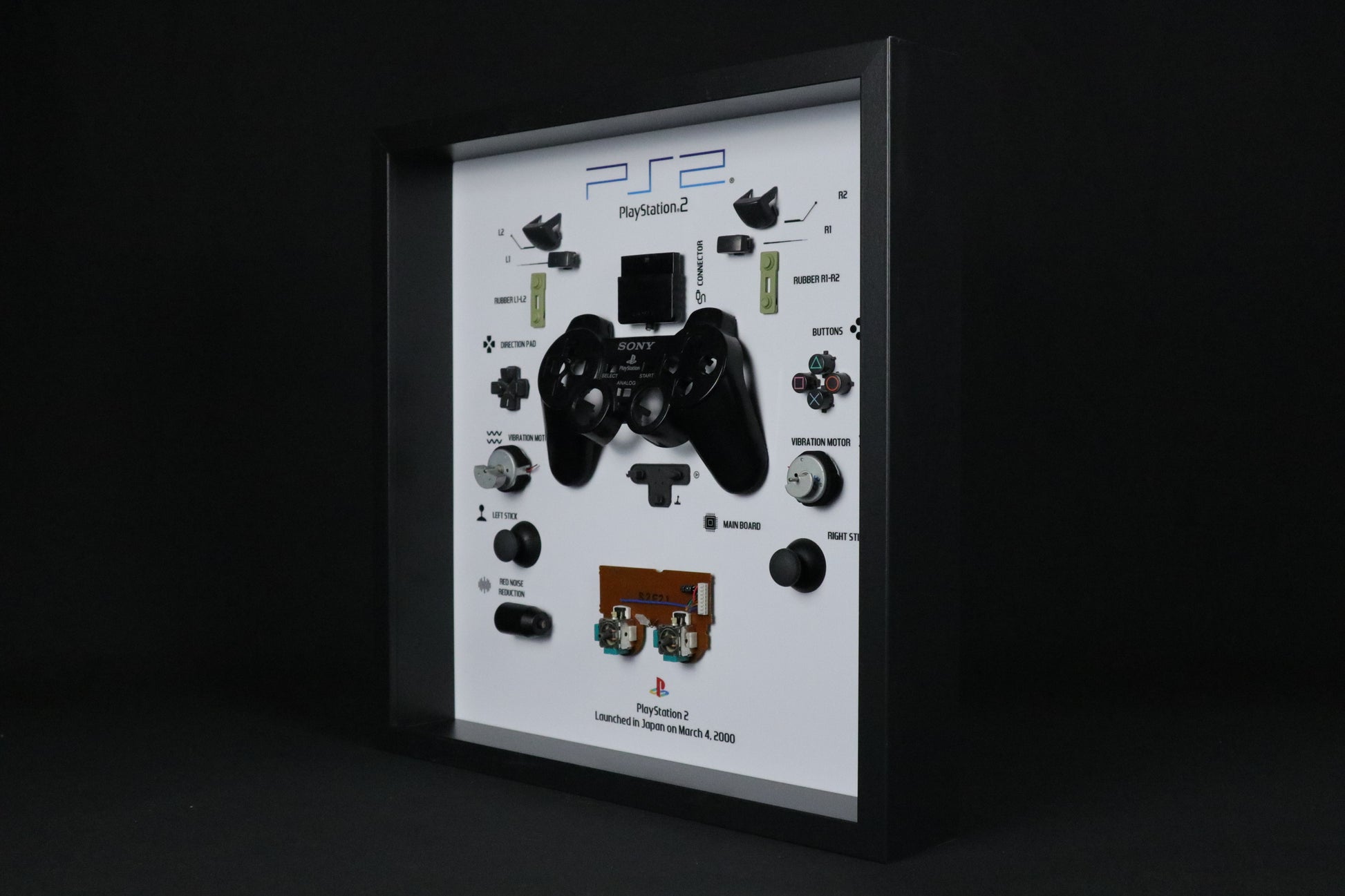 Are you a true PlayStation 2 fan? This one-of-a-kind frame art is a must-have for your collection! Crafted from an original PlayStation 2 controller, this stunning piece showcases a detailed depiction of what is inside of a classic gaming controller!