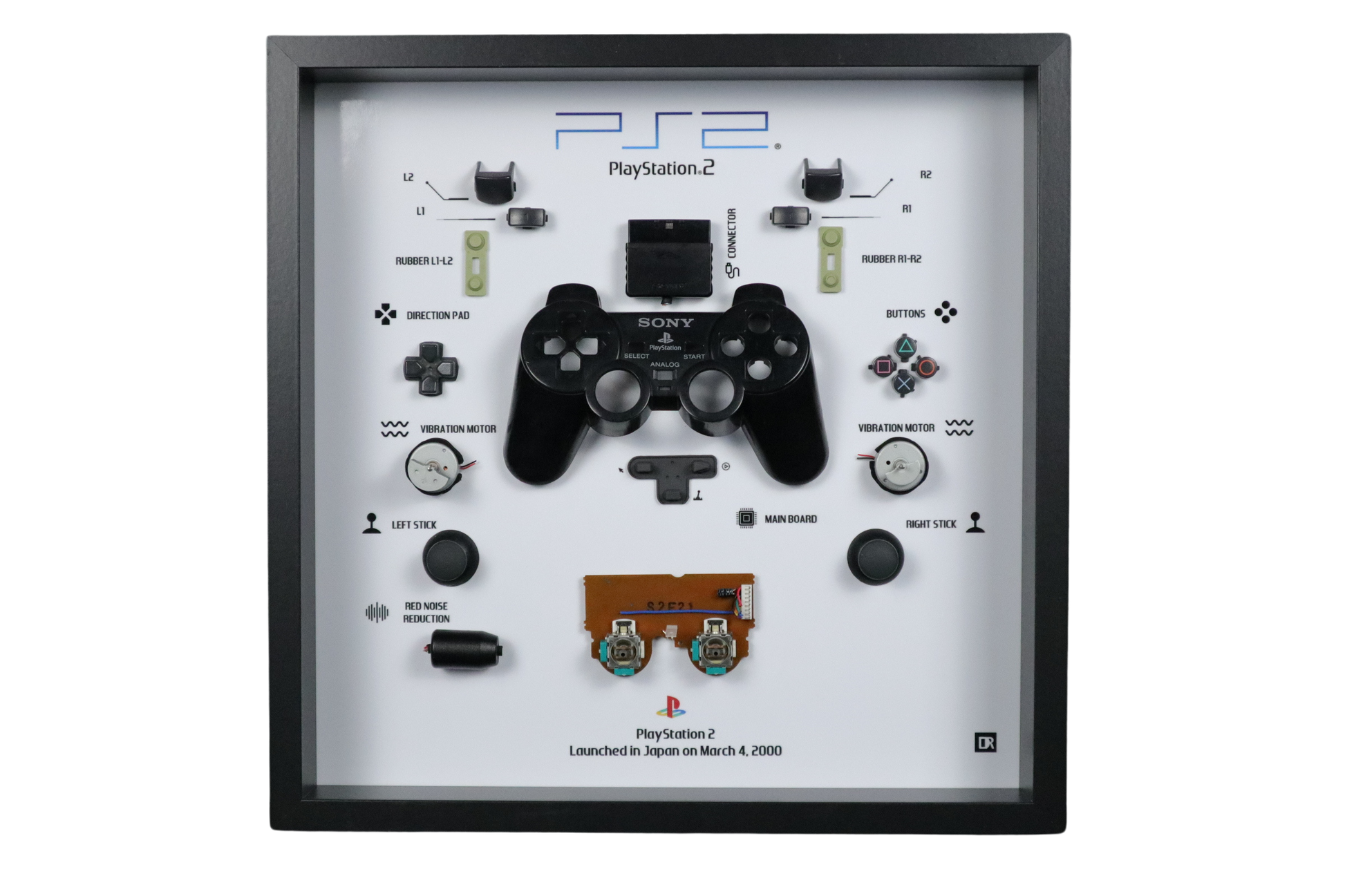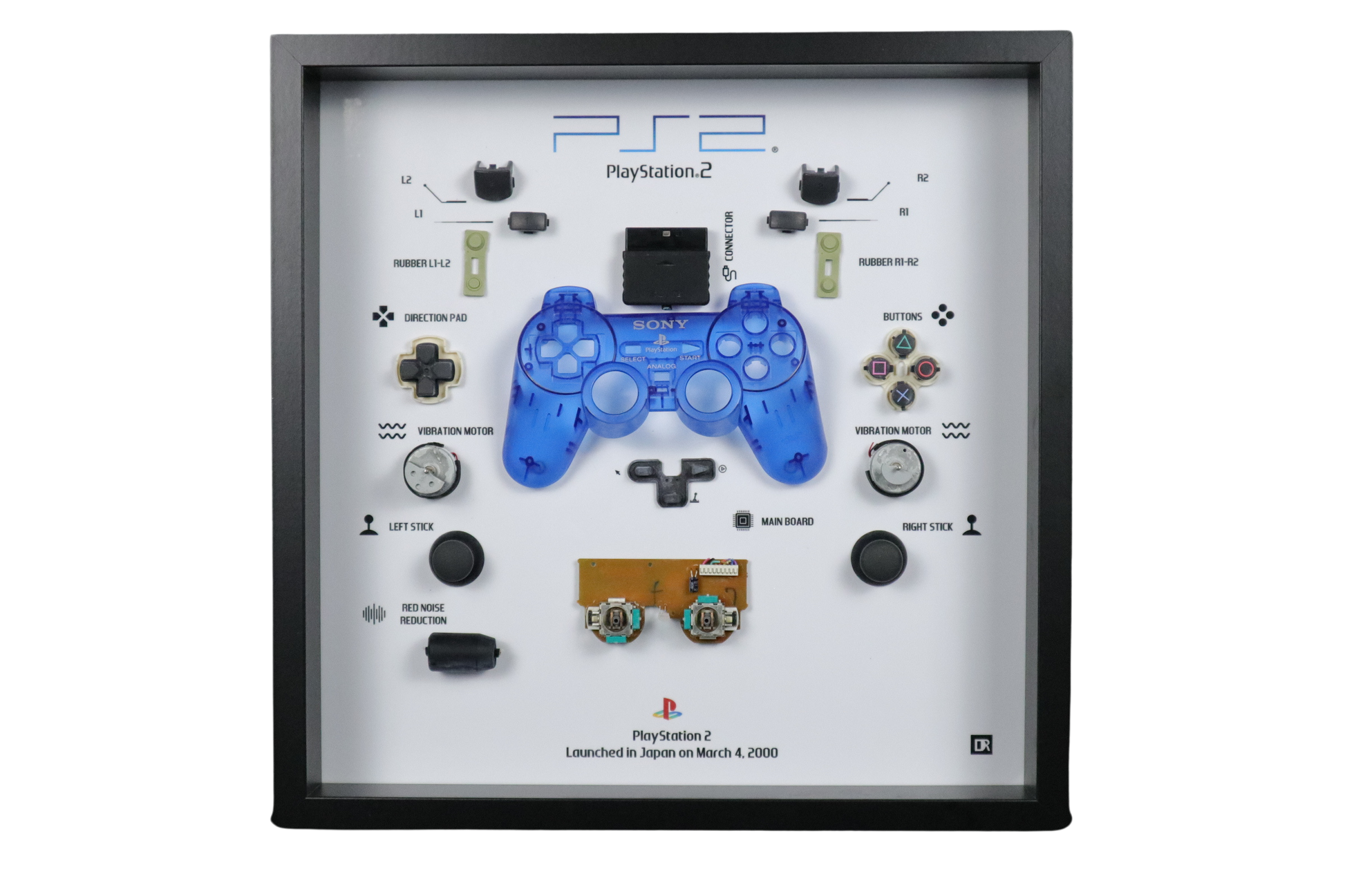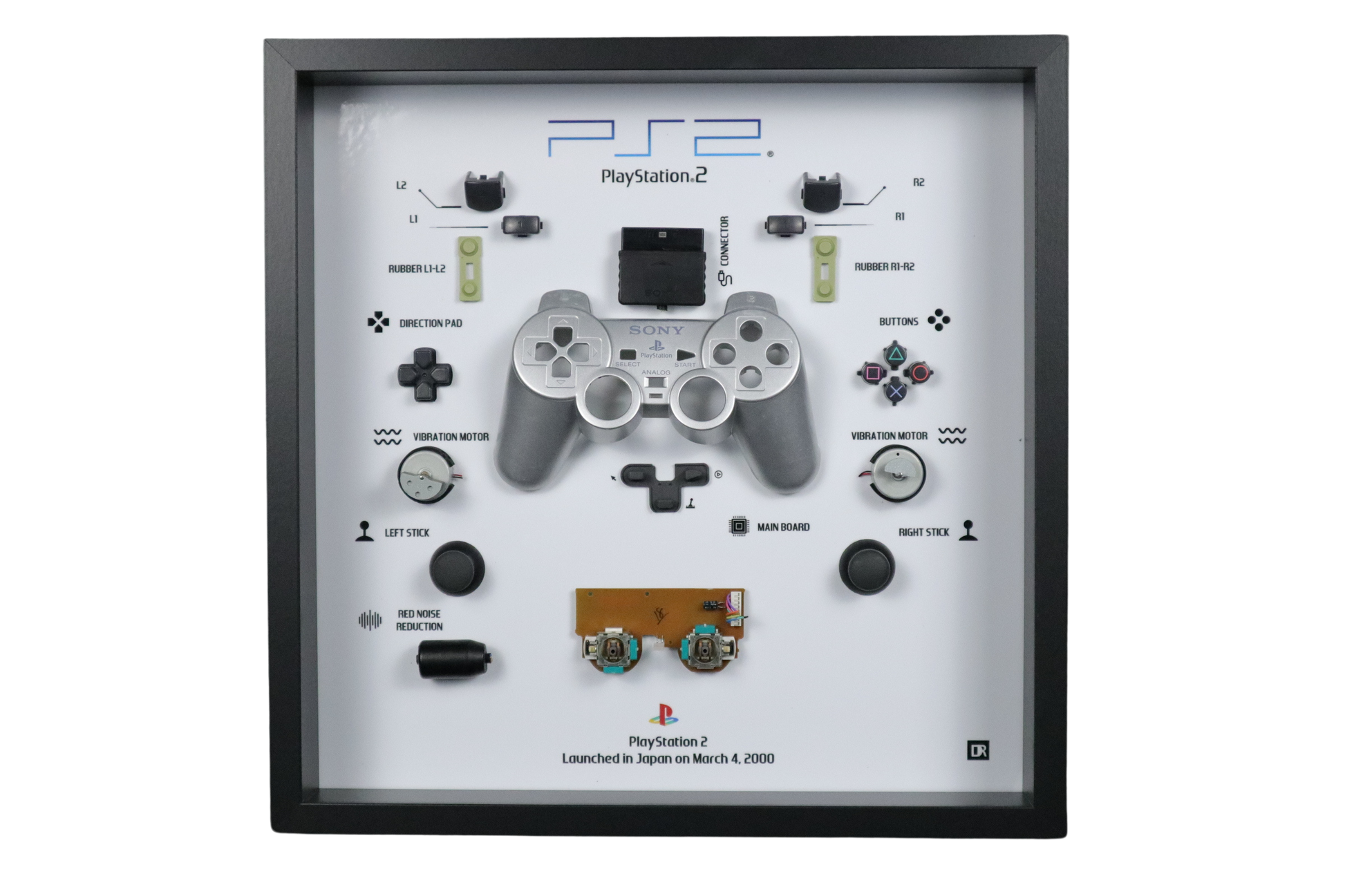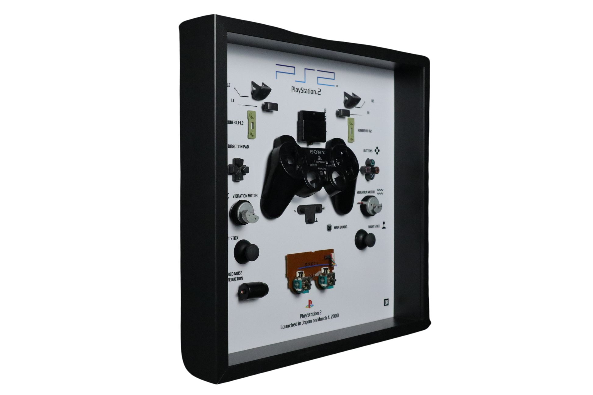 Are you a true PlayStation 2 fan? This one-of-a-kind frame art is a must-have for your collection! Crafted from an original PlayStation 2 controller, this stunning piece showcases a detailed depiction of what is inside of a classic gaming controller!